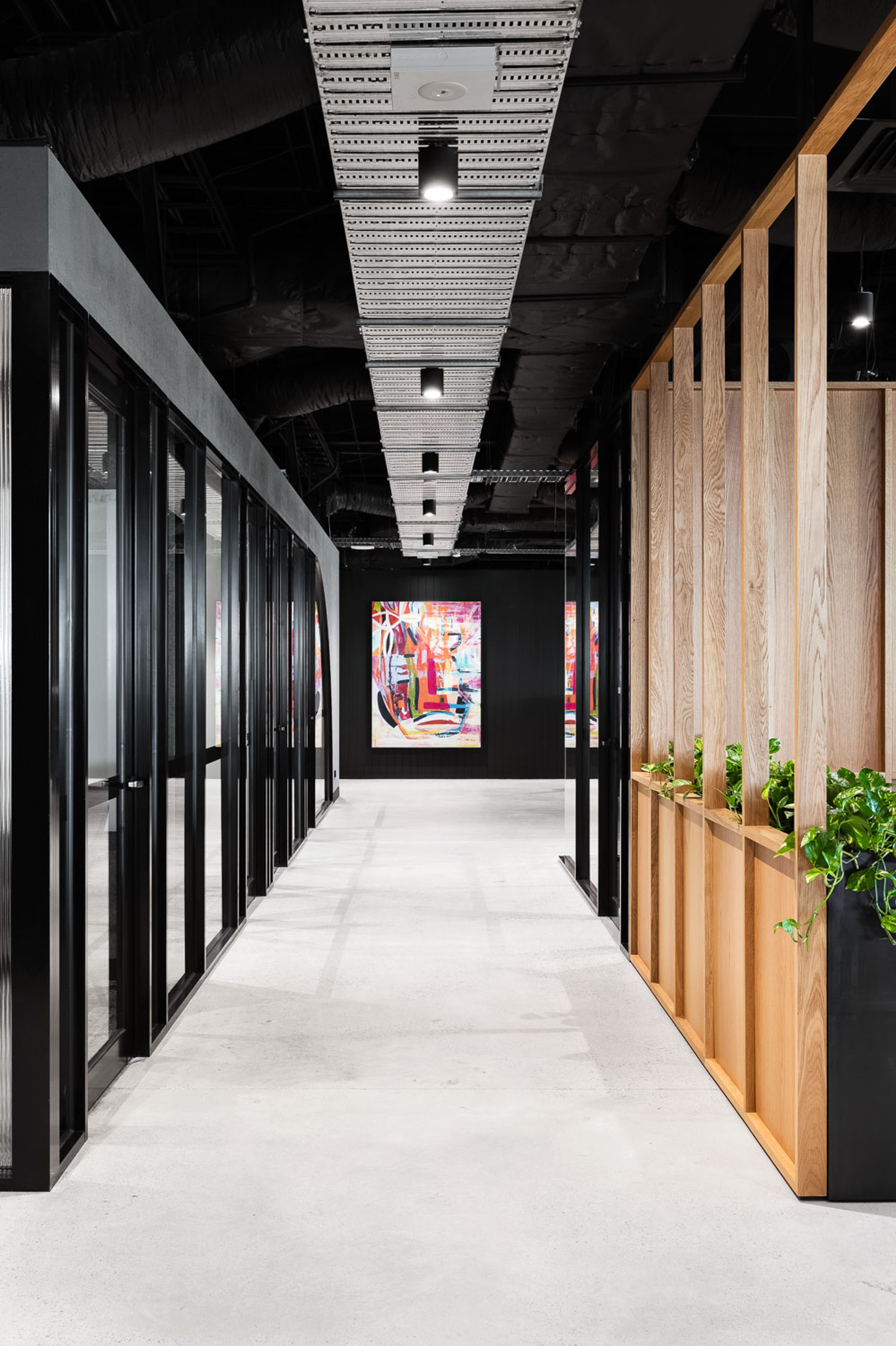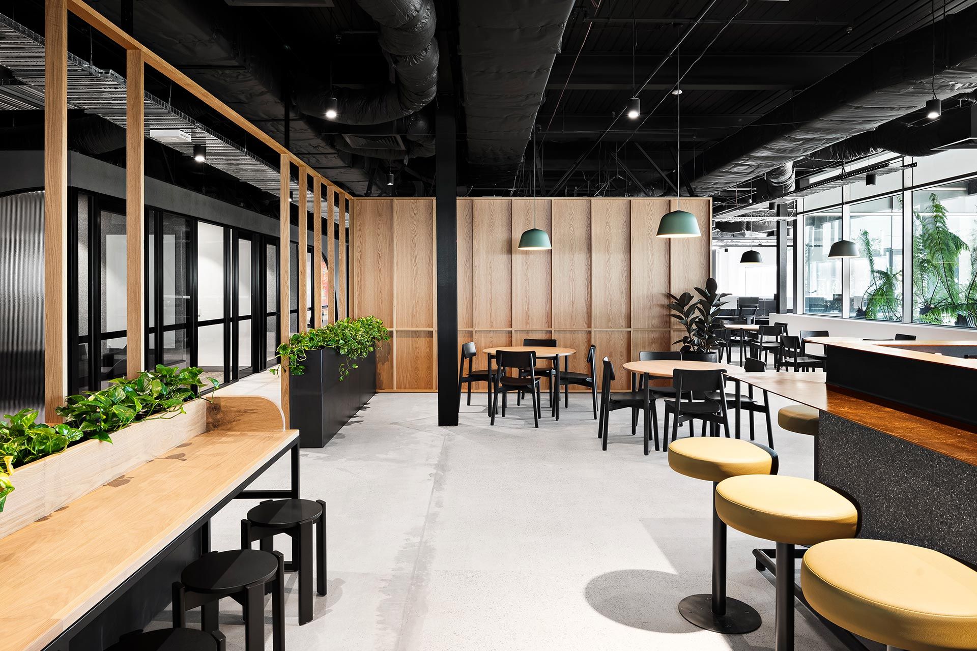"EFM were coming from an office park with nearby amenity, and in the strategy stages it became clear that having that social space outside the walls of the office was an important part of their culture. The new location lacked these, so we incorporated a warm, timber-screened space centered around a serviced café within the office. This area became a social hub for morning coffees and a spot to catch up on emails away from the desk."